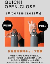 ・簡単に開閉できるユニークなキャップ。3つのボタンを同時にプッシュしてオープン、トリガーを引くと瞬時にロック。キャップは、⼆重密閉構造で、抜群の保温・保冷効果を発揮し、ドリンク漏れもありません。スクリュー式と違い開けにくくなることもなく、お子様でも簡単に開けられます。