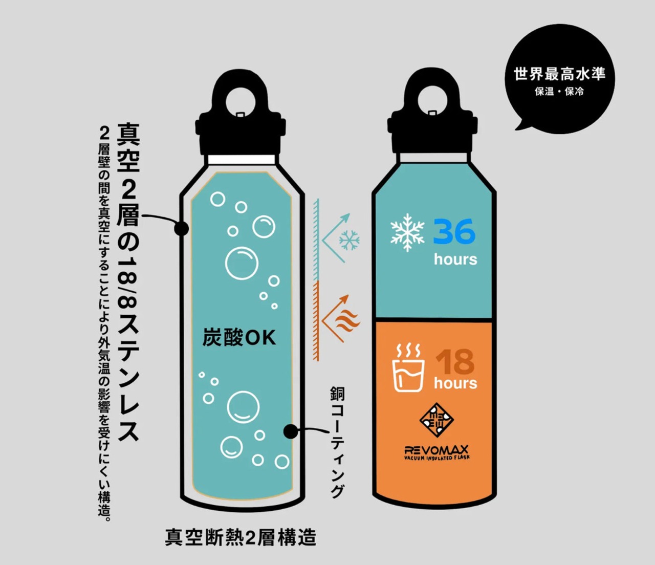 ・REVOMAXは国内でも数少ない炭酸を⼊れられるボトルです。また開閉時に溜まった炭酸を抜くことができる構造のため、飲料が吹き出すなどのトラブルが少ないのが特徴です。冷たいクラフトビールを球場やキャンプ場、海辺などで楽しめます。