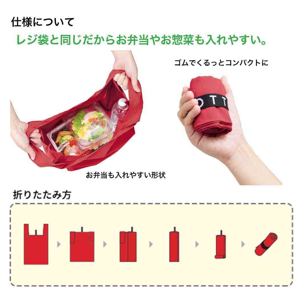 くるりと丸めてゴムバンドでとめると、手のひらに収まるほどのコンパクトサイズで持ち運べるエコバッグです。